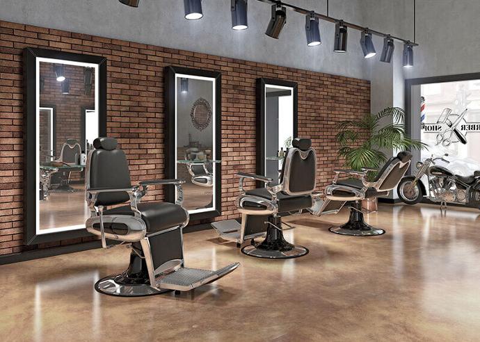 Mobilier pour salon complet barbier  qui s'adapte à toutes les décorations barbershop : 3 coiffeuses ROGER B LED et 3 fauteuils barbiers PRINCE.